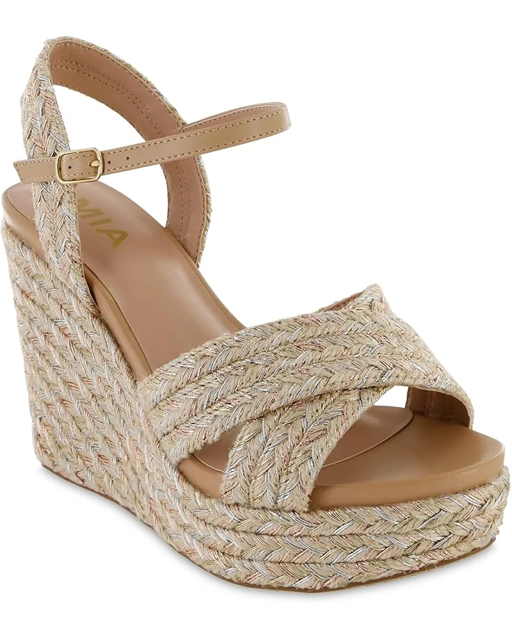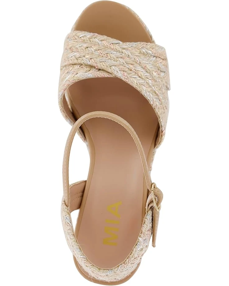 - Stride with uncompromised flair and ultimate comfort wearing the MIAâ„¢ Alouette Sandals. The espadrille footwear features intricately braided plastic upper with backstrap and buckled ankle strap closure.