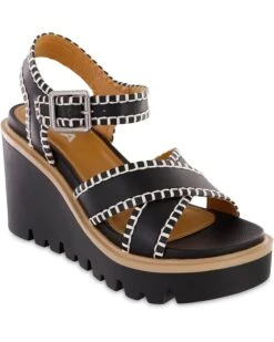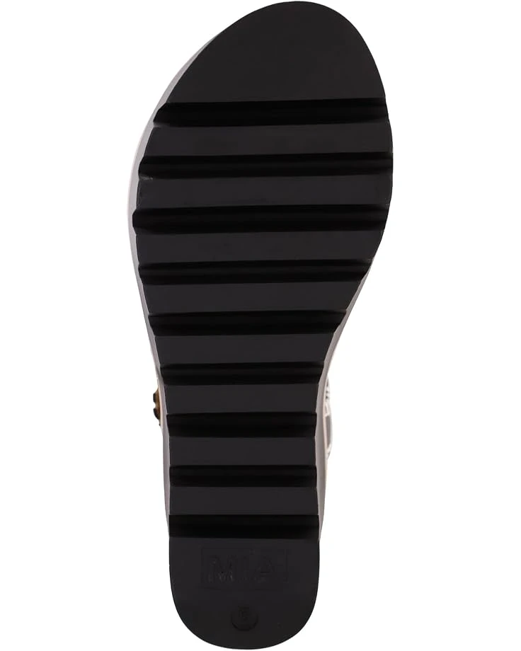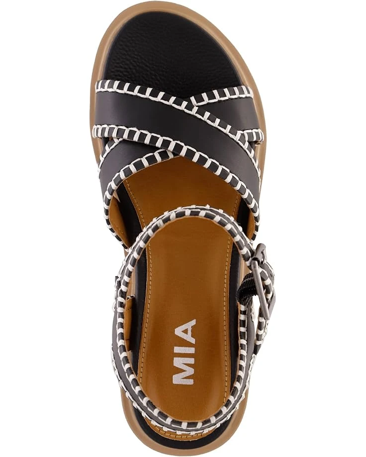 - Stand out with your illuminating style as you wear the MIA™ Cienna Sandals. The wedge-heeled footwear features faux leather upper construction with contrast whipstitch accents, buckled ankle strap closure, and open round toe silhouette.