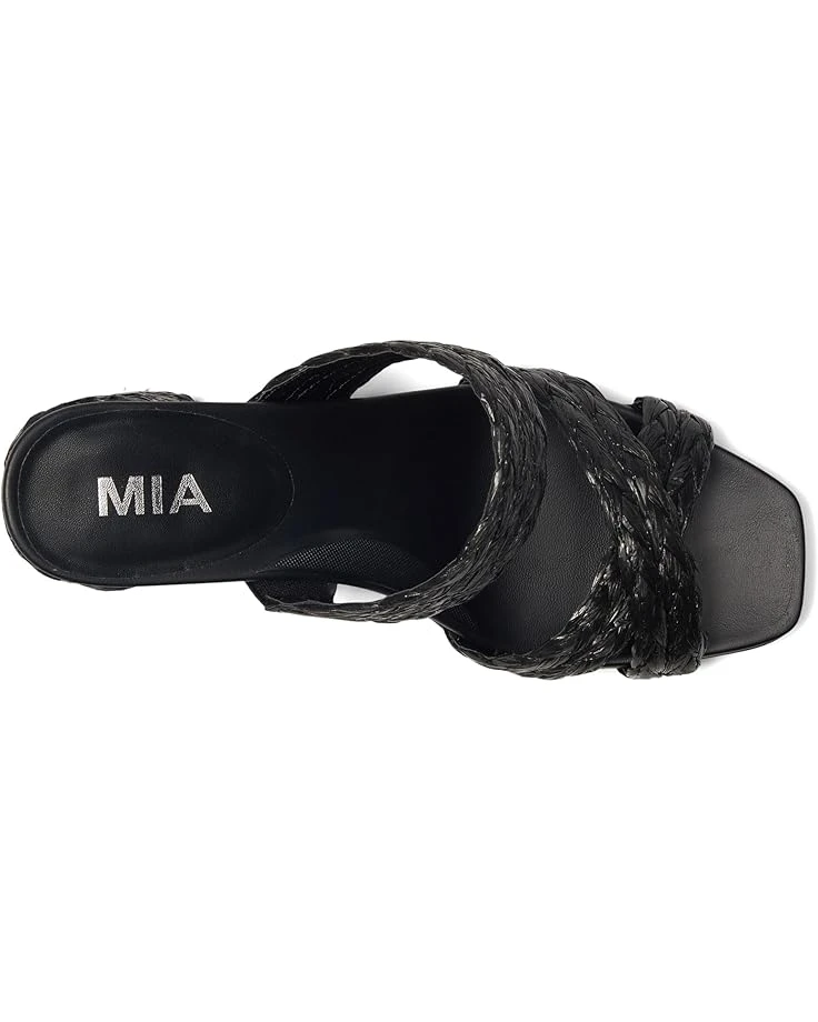 - Dare to be uncommon wearing the MIAâ„¢ Frances. Crafted from faux leather upper, lining, and insole, this pair of sandals features two strap detailing, open square toe, slip-on style, block heels, and brand detailing on the footbed.