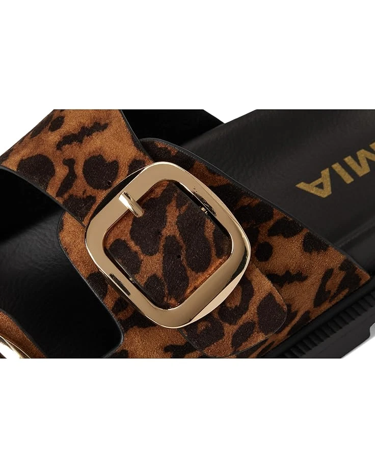 - Keep every step forward with comfort wearing MIA™ Gen-N Sandals. The slip-on style sandals are crafted with a leopard patterned faux leather upper, faux leather lining, and an anatomical faux leather insole. The easy slip-on style and double buckle closure allows easy adjustability.