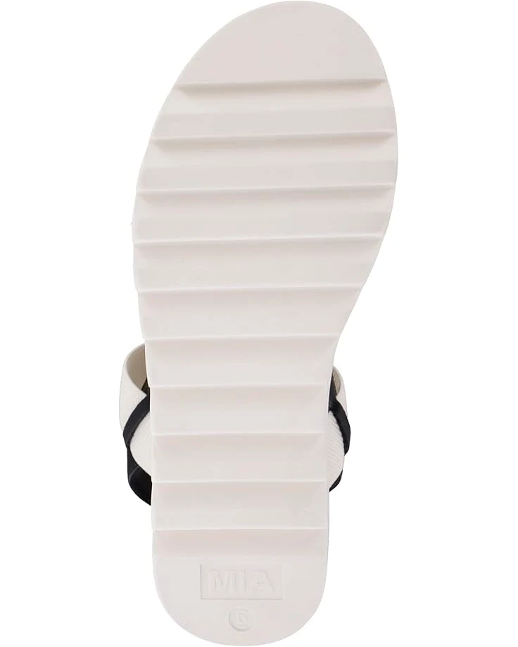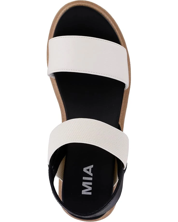 - MIAâ„¢ Jene is a staple when it comes to a statement-making style along with premium comfort. Highlighting a lovely color combination, these lightweight and versatile sandals are designed with a faux leather upper with a single vamp strap and asymmetrical elasticized straps surrounding the ankle for easy on and off. These are set on a signature anatomical contoured faux leather footbed for all-day wear and look impressive with a ridged sneaker-like platform and bottom.