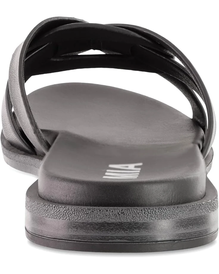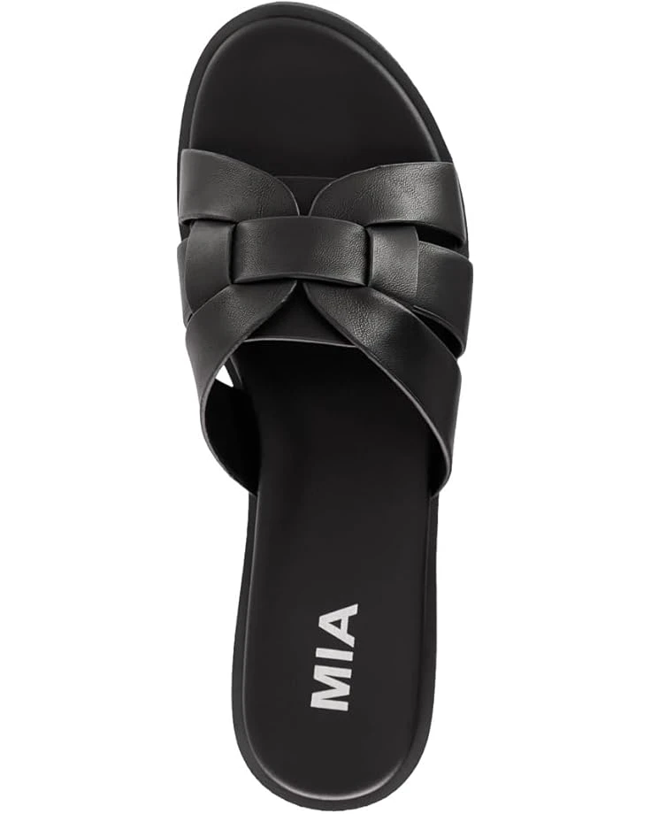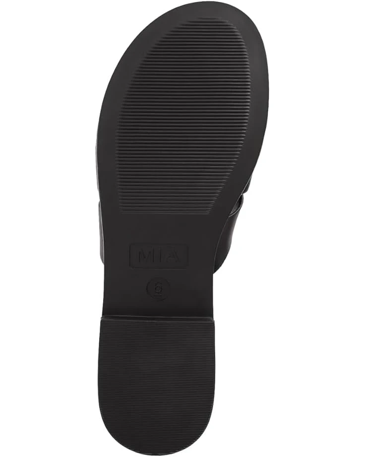 - With twisted upper strap design, the MIA™ Poliana Sandals perfectly exude a vintage style. The slip-on footwear features faux leather upper, lining and insole construction with classic round toe silhouette.