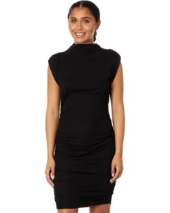 - Radiate joy wearing the fitted silhouette Michael Stars™ Gia Mock Neck Powershoulder Dress. Made from soft ultra rib fabric that washes well and keeps its shape throughout wearing, it features short sleeves, and ruching at the waist for a petite look.